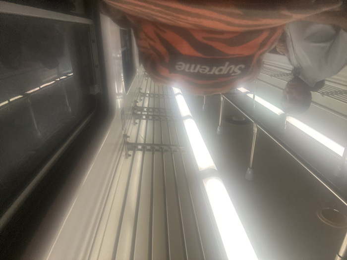The photo shows an interior space, possibly a train or bus. Rows of fluorescent lights run along the ceiling, illuminating a grey floor with circular indentations. Overhead storage racks are visible, along with a handrail supported by slender metal poles. Two people appear in the shot. One wears an orange and black zebra-striped Supreme shirt and another is wearing a white shirt. The image is rotated.
