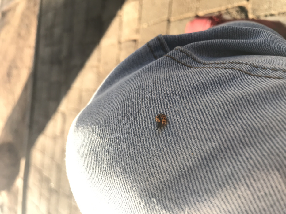The scene, located in Midrand, South Africa, depicts an outdoor environment under natural sunlight. A single orange and black ladybug is situated on light blue denim fabric, which exhibits a distinct twill weave and visible seam stitching. The denim is consistent with a garment, likely a pant leg. The background is out of focus, revealing a sun-drenched paved surface, likely composed of interlocking bricks, upon which a prominent diagonal shadow is cast from an unseen source. A portion of a reddish object is visible in the lower right quadrant, partially obscured by the denim fabric. No human figures are explicitly visible; however, the clothing item implies human presence.