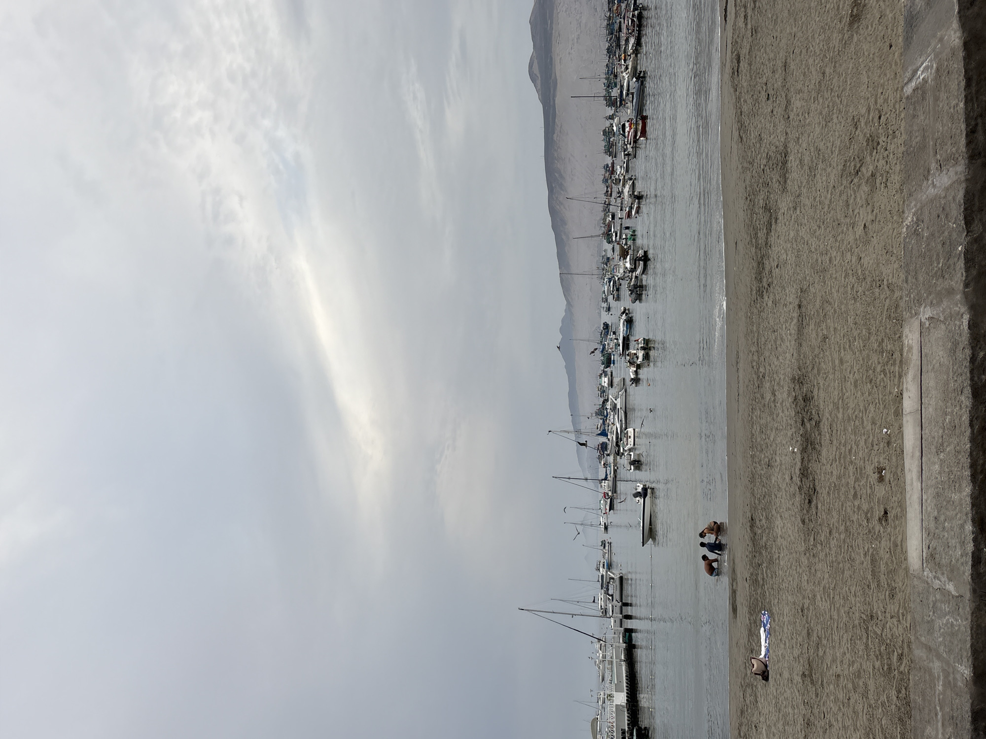 This image depicts the harbor of Ancón, Peru, under an overcast sky. The foreground shows a sandy beach with a concrete retaining wall spanning the bottom edge. On the left side of the sand, a person lies prone on a white and blue striped towel. In the shallow water immediately offshore, three individuals are partially submerged: one wearing dark clothing, and two smaller individuals wearing light blue and tan tops, respectively, actively interacting with the water. The calm bay beyond them is densely populated with numerous moored vessels, including multiple white sailboats with visible masts, smaller motorboats, and various other craft. A white dock structure is visible on the far left, extending into the water. Several dark birds are seen flying low over the water. The background features arid, light-colored sandy hills rising under a uniformly gray, cloudy sky.