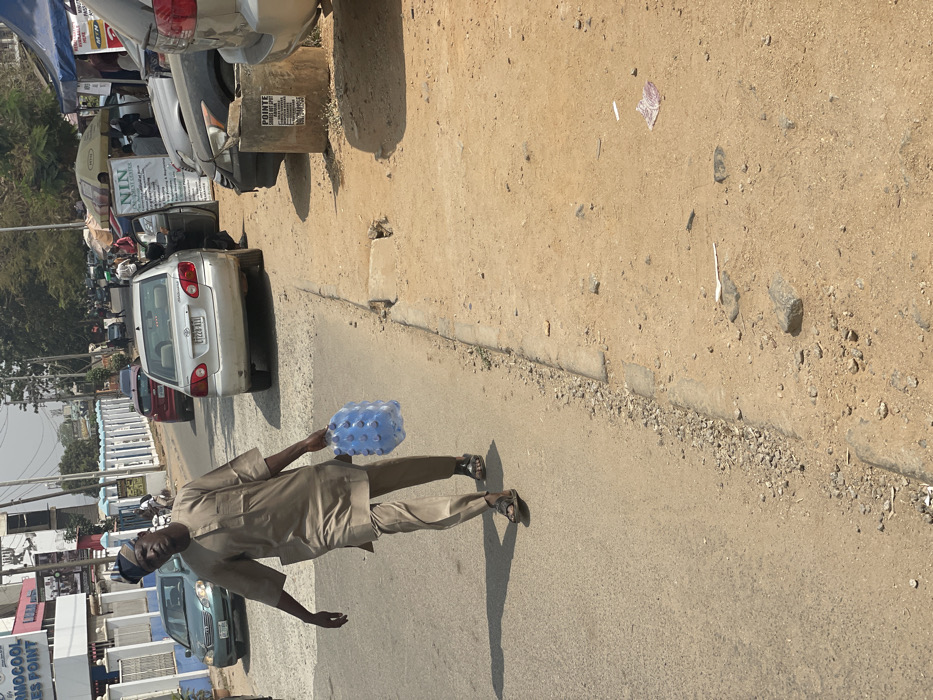 This image depicts a commercial street scene in Abuja, Nigeria, near a "Kool Sales Point" and a "NIN Enrollment Center." The scene is illuminated by daylight, casting strong shadows. In the foreground, an adult male with dark skin and wearing a light-tan traditional Nigerian garment consisting of a tunic and trousers, along with dark sandals and a patterned cap, walks on the asphalt road. He holds approximately 18 to 20 small, clear plastic water bottles bundled together in his right hand. He casts a distinct shadow to his left. The road features active and parked vehicles. On the right side, a silver Toyota Corolla (license plate T229-XTT) is parked facing away from the viewer, followed by a dark-colored sedan with an open driver's side door. Adjacent to these vehicles, on the unpaved shoulder, a "NIN ENROLLMENT CENTER" operates from a temporary stall, marked by a white sign listing "Enrolment, Verification & Registration" services. A concrete cylindrical advertising structure labeled "POINTE" with a partial phone number is also present on the shoulder. On the left side of the asphalt road, a multi-story building is visible, featuring a prominent blue and white sign for "KOOL SALES POINT." A teal-colored sedan is parked near this building. A blue and white ornate fence borders the left side of the street. Additional vehicles and indistinct pedestrian figures are visible further down the street. The immediate unpaved shoulder is composed of reddish-brown dirt and small rocks, with minor litter. A concrete curb separates the road from the unpaved area, and a damaged drainage opening is visible within the curb. The sky is clear and bright.