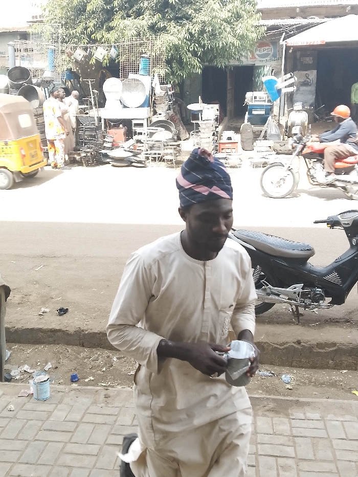 The scene depicts a street in Kofar Mazugal, Nigeria. In the foreground, a dark-skinned male, wearing a light-colored traditional tunic and a blue and pink striped cap, walks towards the left on a paved sidewalk. He holds a small cup or container, enclosed within clear plastic, in his hands. A black motorcycle is parked on the sidewalk to his right. A partially open paint can and scattered debris are on the ground near the sidewalk curb. Across a dusty road, a yellow Keke Napep is partially visible on the far left. Two males, one in a patterned tunic, stand near an open-front shop on the opposite side of the road, which displays numerous metal kitchenware items such as large pots, basins, and industrial fans. A large green tree provides shade over this shop. To the right, an adjacent building features a "PEPSI" sign. A person wearing an orange helmet rides a red motorcycle away from the camera on the road. The environment suggests a commercial district.