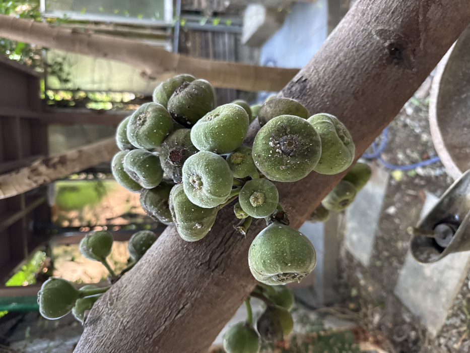 - "The image displays a close-up, diagonal view of a robust, textured brown tree branch densely covered with clusters of small, unripe green fig-like fruits" by FM-B7oyh1, licensed under CC BY 4.0