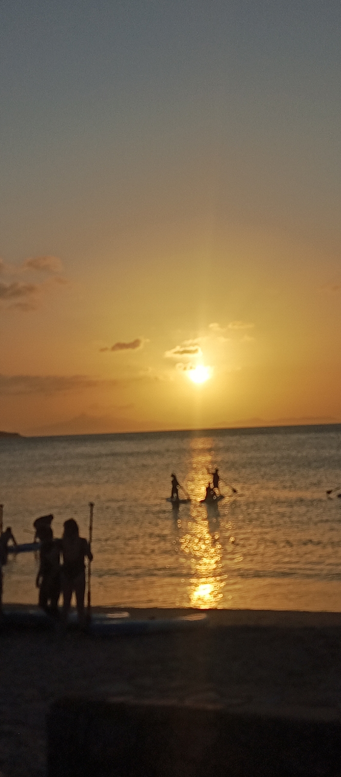The image depicts a beach scene at sunset in Juan Griego, Venezuela. The sky transitions from a darker blue-grey at the top to a vibrant orange-yellow hue near the horizon. The sun, a bright yellow-orange orb, is positioned centrally above the horizon, partially obscured by scattered clouds, casting an intense reflection path across the calm water. In the mid-ground, within the body of water, three individuals are silhouetted on paddleboards. Two figures are standing upright on separate boards, each holding a paddle, while a third figure is positioned on another board further to the right. In the foreground, on a dark sandy beach, several additional figures are silhouetted. Two figures are visible standing near the left side of the frame, holding paddles. A paddleboard is present on the sand in front of them. A indistinct landmass is visible on the distant horizon line across the water.