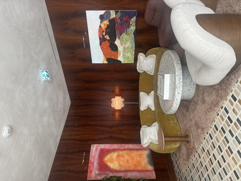 The image displays an interior corner of a lounge area, specifically identified as the lobby lounge of the Park Hyatt Doha in Msheireb Downtown Doha, Qatar. The walls are covered in dark, highly polished wood paneling with a prominent grain. The ceiling is a light, textured concrete or plaster, featuring a white circular fire alarm and a green illuminated exit sign with a right-pointing arrow. The central seating arrangement includes a curved, mustard-yellow velvet sofa with three white, textured throw pillows (two rectangular, one hourglass-shaped). In front of the sofa is a round, white terrazzo coffee table with a pedestal base, upon which rests a white rectangular box, possibly a book or decorative object. To the left of the sofa, a small round side table with a reddish-brown top and cylindrical base is positioned. To the right, a dark reddish-brown armchair with textured upholstery is partially visible, alongside a white bouclé-textured armchair with a wooden base in the immediate foreground. Two large artworks are mounted on the wooden walls, each illuminated by a small brass picture light. The left painting is vertical, depicting an abstract red, orange, and yellow arch-like form. The right painting is horizontal, an abstract composition featuring a reclining form in blocks of red, black, orange, blue, green, and white. A tall floor lamp with a clear, ribbed glass shade stands in the corner behind the sofa, emitting a warm glow. The floor is a mosaic of rectangular tiles in varying shades of beige, brown, and grey, partially covered by a thick, shaggy light pinkish-brown rug beneath the seating area. A sliver of green foliage from a plant is visible on the far left. No individuals are present in the scene.