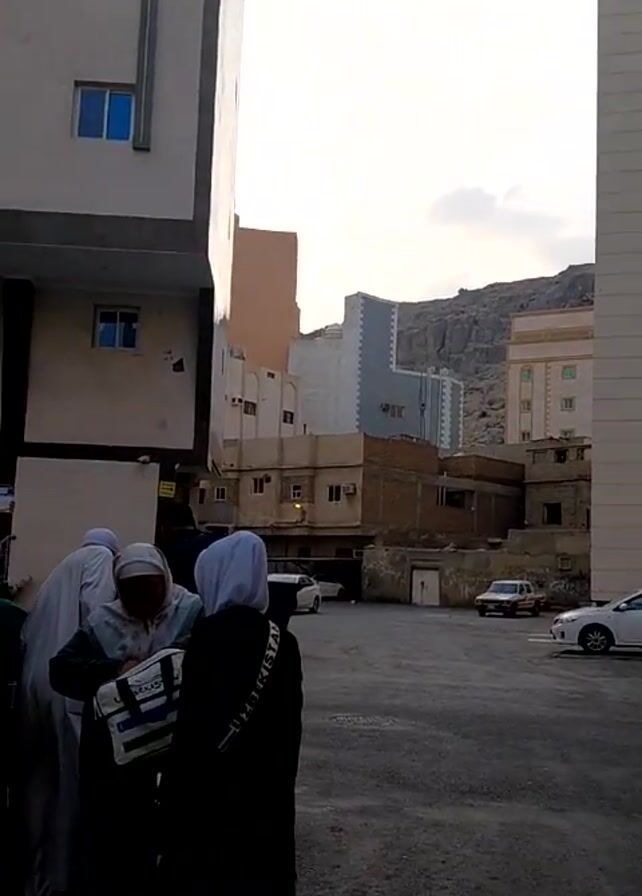 group of people standing in a paved area between buildings. The people appear to be wearing religious attire. A large mountain is visible in the background. Several cars are parked in the area. Someone is speaking in the background. The weather appears overcast.
