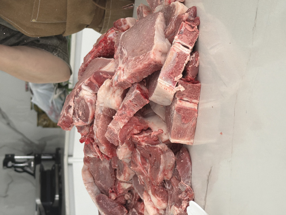 The image presents a substantial, irregularly mounded pile of freshly cut raw meat, predominantly pork, centered on a clean white countertop with subtle gray veining