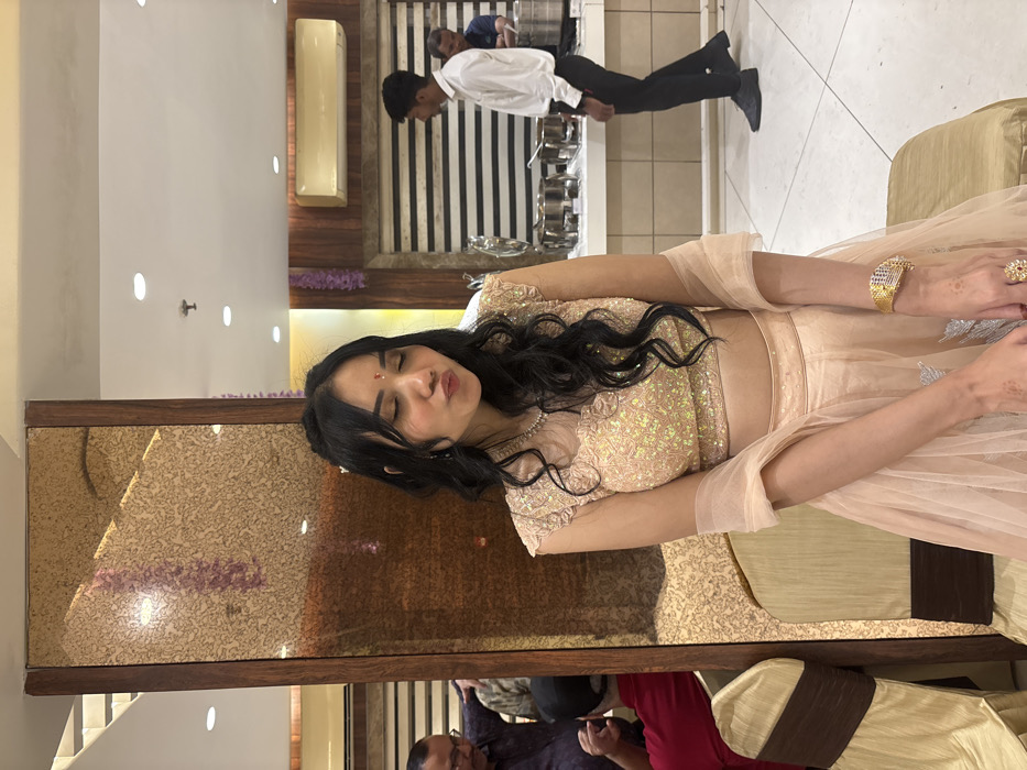 A woman with dark curly hair, wearing a peach-colored, sequined top and a matching sheer skirt, poses with pursed lips. She has jewelry on her hands. She leans against a textured, framed wall. In the background, blurred figures suggest a social gathering. A man in a white shirt and dark pants is visible near buffet tables against a striped wall. The setting appears to be an event venue or restaurant.
