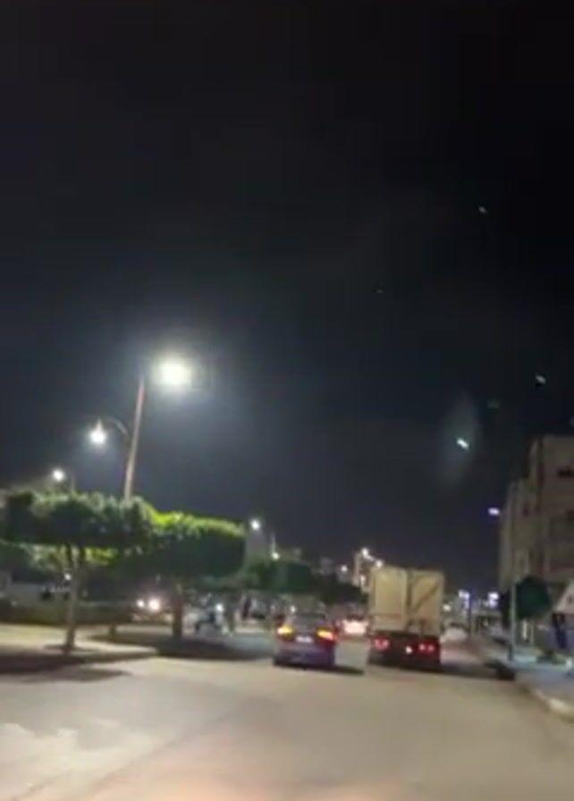 night street scene. A gray car and a large truck with a light-colored container are driving on the street, away from the camera. The street is lined with trees, streetlights, and buildings. There are also people walking along the sidewalk. The sky is dark, and there appear to be small lights or stars visible. The camera is held steady.