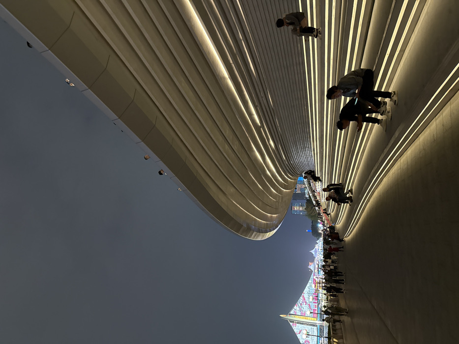 - "The image presents a nighttime outdoor scene in Haizhu District, China, centered around a large, curved, multi-tiered architectural structure, likely a grandstand or amphitheater" by FM-Mlchq1, licensed under CC BY 4.0