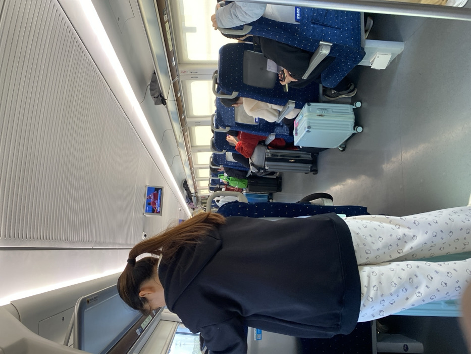 The image depicts the interior of a high-speed train carriage, indicative of transportation infrastructure found in Shunde District, China. The scene is viewed from near the front of the carriage, looking down a central aisle. In the immediate foreground, a person with medium-brown hair tied in a ponytail stands with their back partially to the viewer, facing towards the left side of the carriage. They wear a dark, possibly black, hooded sweatshirt and light-colored pants with a repetitive pattern of small dark shapes. Part of a light blue object is visible near their feet. The carriage features rows of dark blue, speckled seats with light grey headrests and armrests, arranged on either side of a light grey aisle. Large windows with white frames line the side of the train, showing a bright, blurred exterior, suggesting motion. Overhead luggage racks extend along both sides, with some personal items visible, including a grey bag. Above the aisle, a small television screen displays a scene with two figures in red and white attire. Overhead white strip lighting illuminates the ceiling, which has a ribbed texture. A small security camera is mounted on the ceiling. Several passengers are seated further down the aisle. A person in a red top is visible on the left side, seated in a dark blue seat. Next to them, a dark grey rolling suitcase stands in the aisle. Directly across the aisle, a light aqua-colored rolling suitcase is positioned near another seated passenger. Further back, a bright green bag is also in the aisle. Another passenger, wearing a dark jacket, is visible on the right, utilizing a laptop on a tray table and holding a mobile phone. Text on a panel in the lower right corner reads "安全出口" (Safe Exit). The overall environment appears clean and well-lit.