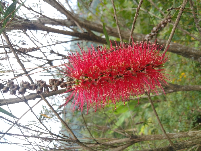 - "The image depicts a close-up, vertical view of a vibrant red bottlebrush flower, likely a species of *Callistemon* or *Melaleuca*, situated outdoors in El Rincón de Monagas, Venezuela" by FM-f4dh13, licensed under CC BY 4.0