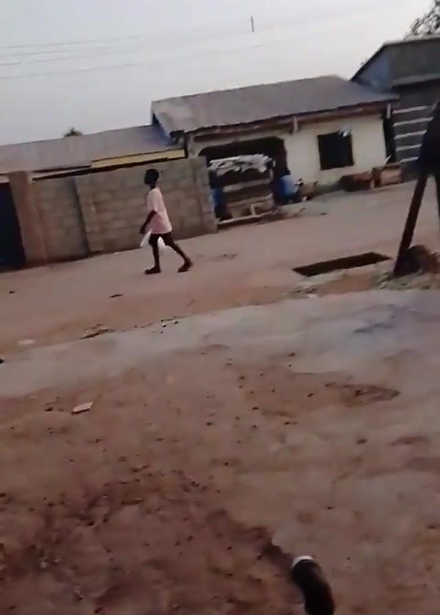 person walking through a dirt yard in front of several buildings. The person is wearing a pink shirt and black pants and is carrying something in their hand. The yard is cluttered with various objects, including a water tank on a wooden frame, buckets, and pieces of wood. There are also buildings in the background, including one with a satellite dish on the roof. The video is shaky and the image is not very clear.