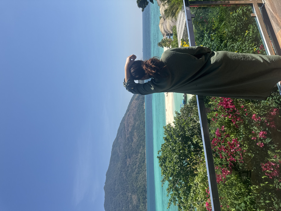 An individual is observed from behind, standing on an elevated balcony in Ban Ko Li Pe, Thailand, facing a panoramic coastal view under a clear blue sky