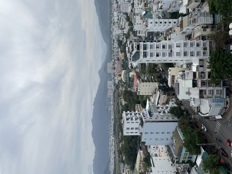 An urban scene captured from an elevated perspective. A dense cluster of buildings dominates the right side, primarily white structures with varying architectural styles. A road with traffic cuts through the buildings. In the distance, a mountain range forms a hazy backdrop. A cloudy sky fills the left side, providing a contrast to the built environment.