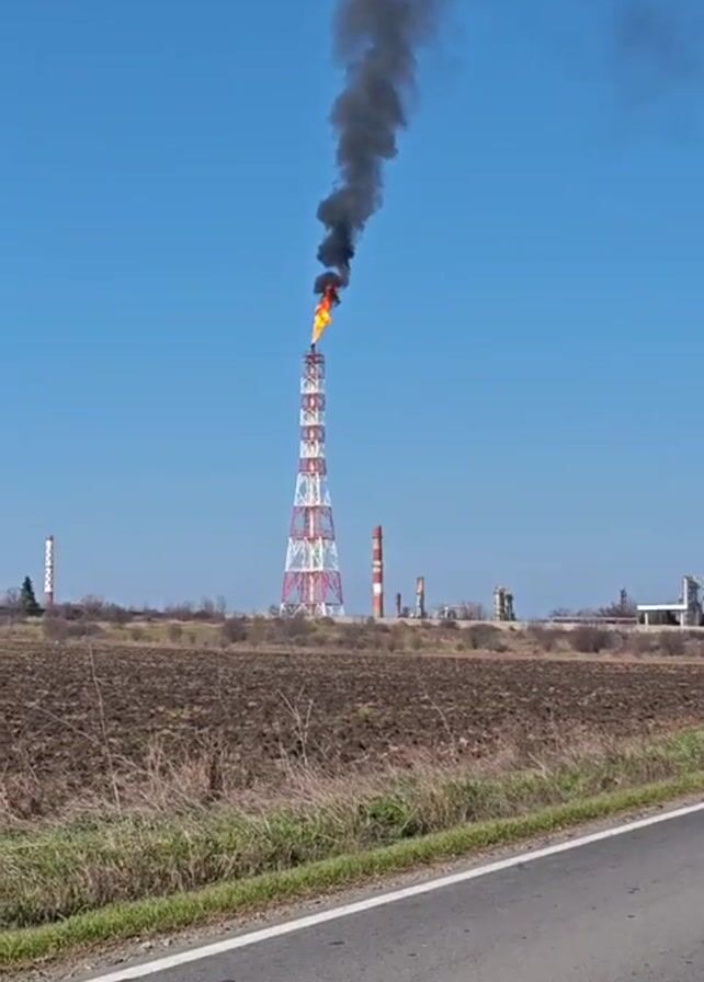 tall industrial flare stack burning off excess gas, producing a large plume of black smoke. The tower is painted red and white in a striped pattern and stands in an industrial area with other refinery structures visible in the background. A brown field is visible between the road and the facility. The sky is clear and blue. The camera is steady.