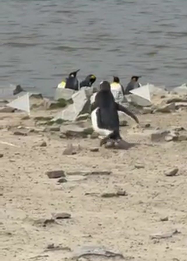 penguin walking on a sandy beach towards the water