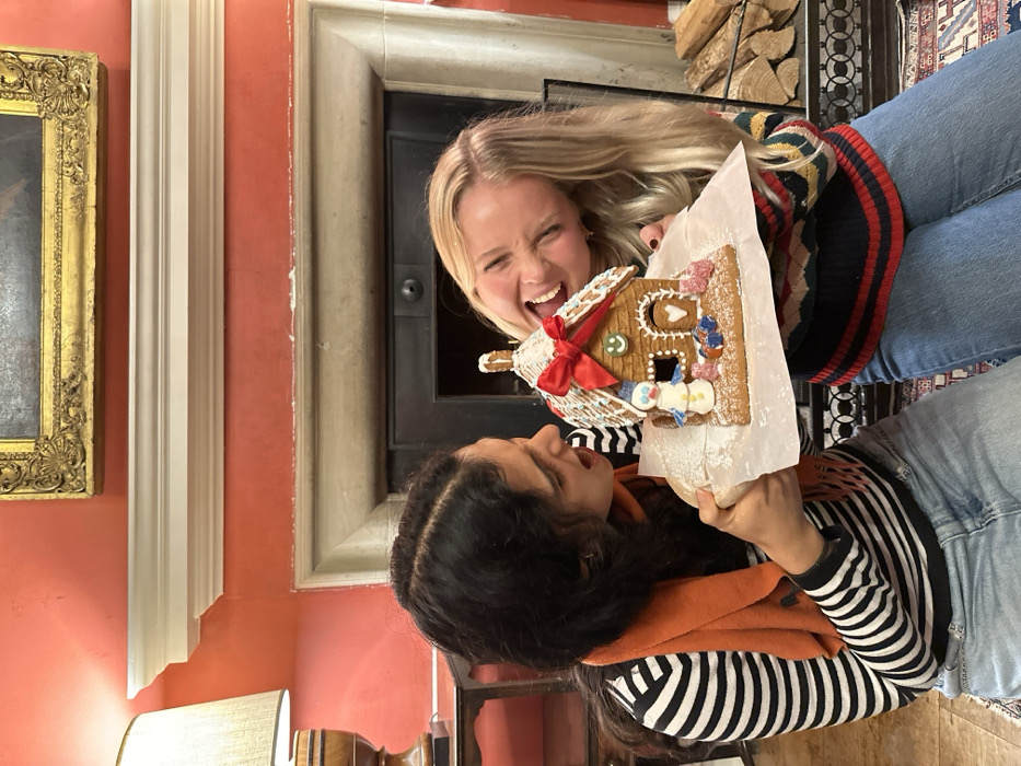 Two women hold up a gingerbread house. The blonde woman in a striped sweater is screaming with her mouth wide open. The brunette woman in a black and white striped shirt and orange scarf looks up at the gingerbread house with a slightly open mouth. The gingerbread house has a red bow and a small snowman decoration. They are in front of a fireplace with wood stacked beside it. A gold-framed painting hangs on the coral-colored wall.