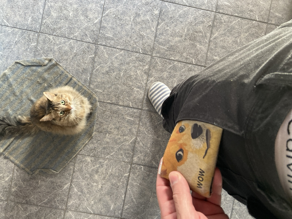 An indoor scene in Ushuaia, Argentina, is depicted from an overhead perspective. A fluffy, long-haired tabby cat with green eyes sits on a small, striped mat on a grey tiled floor, looking directly upward. In the immediate foreground, the lower torso and legs of a human are visible. The individual wears dark trousers, a partially visible "Calvin Klein" waistband, and a single blue-and-white striped slipper on the right foot. The human's left hand holds a small, rectangular object adorned with the 'Doge' meme image and the word 'WOW', positioned near the left thigh. The cat's gaze is directed towards the human and the object.