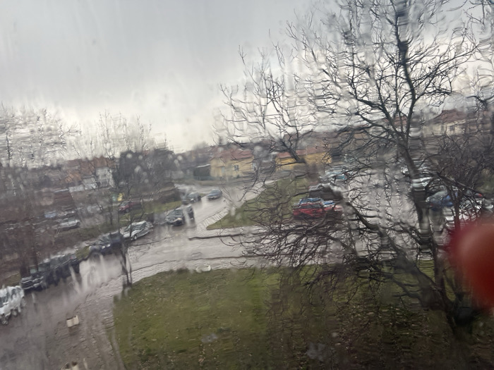 The image presents an elevated, slightly obscured view of a residential area in the city of Novi Iskar, Bulgaria, under an overcast sky. The perspective is through a wet pane of glass, indicated by numerous water droplets and streaks that distort the scene. A blurred red object, consistent with a human finger, is visible in the lower right corner of the frame. In the midground, a wet, dark asphalt road curves from the lower left towards the upper right. Several vehicles are parked along this road on the left. The road leads into a wider paved area, likely a parking lot, situated centrally to the right. This area contains numerous parked cars of various colors, including a distinct red vehicle. Two vehicles appear to be in motion on the road, exhibiting slight blur. Bare deciduous trees with intricate branch structures are prominent throughout the scene, particularly in the foreground and midground on the right, suggesting a colder season. Patches of green grass are visible in the lower central part of the frame. In the background, a cluster of low-rise residential buildings is visible. These structures feature predominantly orange-tiled roofs and facades of various light colors, including yellow and white. The sky is uniformly light grey and overcast. No discernible people are visible in the scene.