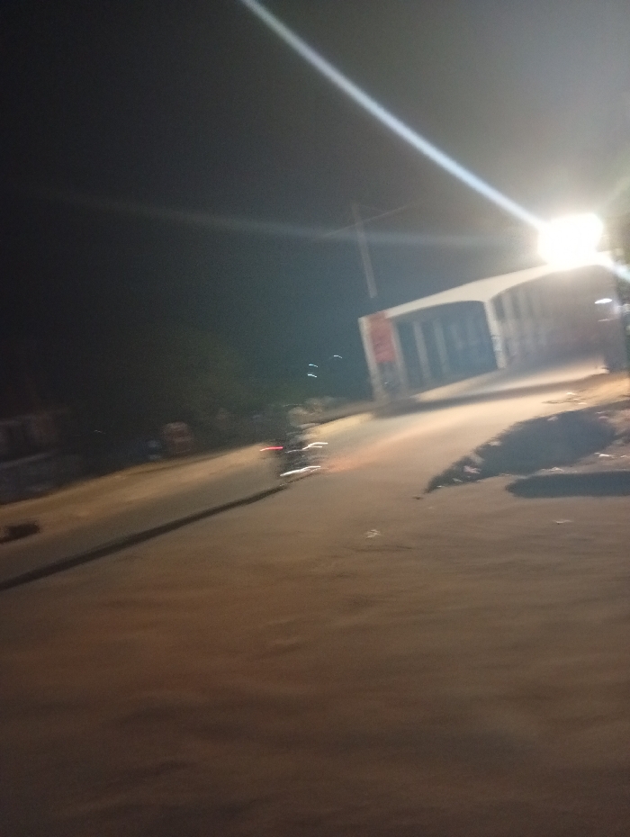 A nighttime street scene under a bright light illuminating a paved road. A blurred vehicle moves along the road. A building structure with archways stands in the background. The sky is dark, contrasted by the intense light reflecting off the road surface and surrounding objects. Some undefined dark mass is at the lower right corner.