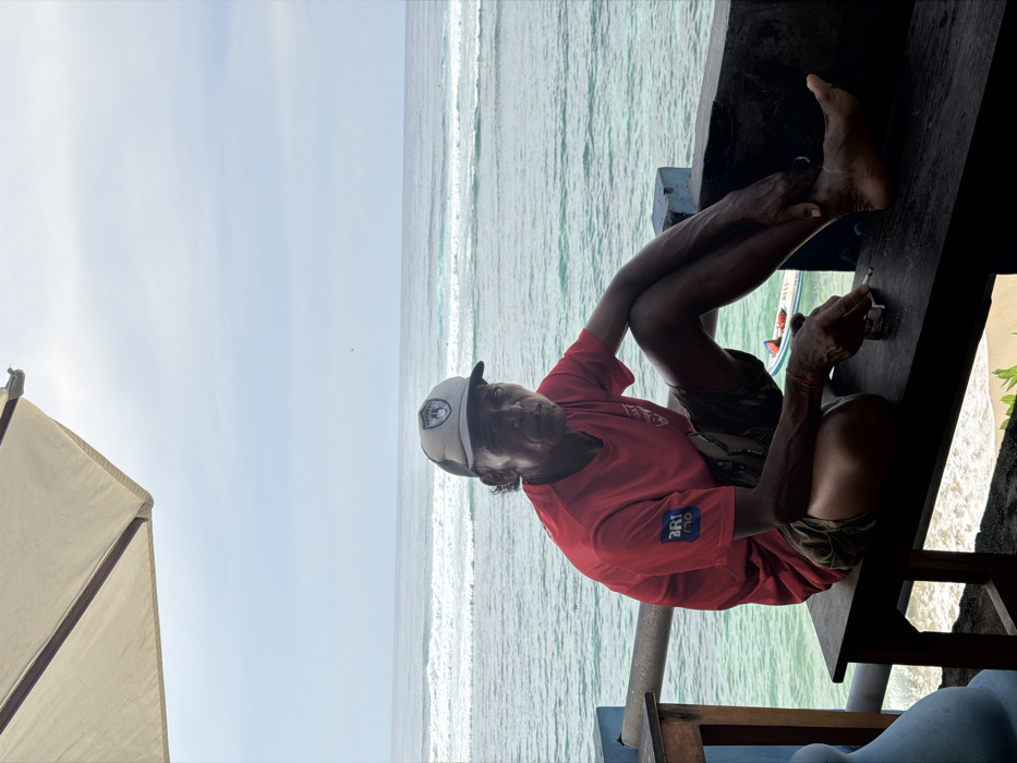 A man sits cross-legged on a dark wooden ledge near a beach. He wears a red shirt, camouflage shorts, and a light-colored baseball cap. He holds a lit cigarette in his hand. Behind him, the ocean stretches to the horizon under a partly cloudy sky. An umbrella and vegetation are also visible. The image is rotated.