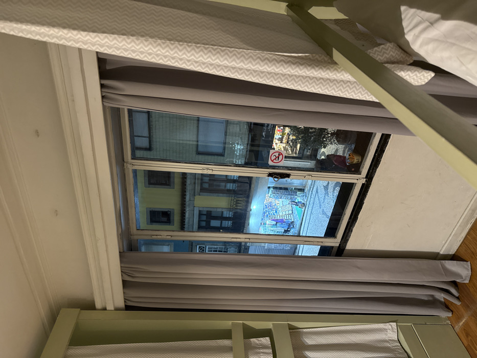 The image displays an interior room looking out a multi-pane window onto a street in Porto, Portugal, at night. Within the room, portions of a light green wooden bunk bed frame are visible on both the left and right, with white patterned privacy curtains hanging from them. Gray opaque curtains partially frame the central window. The room has a visible wooden floor at the bottom left and a white ceiling with decorative molding. On the windowsill, a small potted olive tree and a clear glass container containing yellow and orange items are present. A red circular sticker, indicating "no smoking 24h," is affixed to the right windowpane. Through the window, a cobblestone street, featuring a distinctive wave-patterned *calçada portuguesa*, is illuminated by artificial light. Across the street, a multi-story building with a yellow facade and balconies is visible, flanked by another building with a lighter, possibly light blue-grey, facade to its right. At street level, two brightly lit shops are open. The storefront on the left, illuminated with a blueish light, displays numerous colorful textiles and merchandise, consistent with a souvenir or crafts shop. The storefront on the right appears to be a smaller retail outlet. One individual, dressed in dark and red clothing, is partially visible near the right storefront at street level. The architectural style and street features place the scene within the historic Baixa district of Porto.