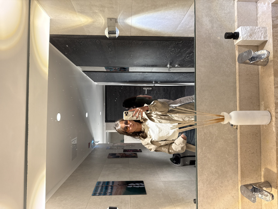 The image depicts a female individual taking a mirror selfie in a modern restroom or public washroom in Cannes, France. The woman has light brown hair with bangs, wears amber-tinted glasses, a white short-sleeved top, a beige hooded jacket, and blue jeans. She holds a light-colored smartphone with her right hand to capture her reflection, while her left hand is in her jeans pocket. Her expression is neutral. A second female individual, with dark hair and wearing a dark top, is partially visible in the reflection behind the primary subject, appearing to walk away. The immediate foreground displays a light beige stone countertop. On the counter, from left to right, are a silver single-lever faucet, a white ribbed cylindrical diffuser bottle containing several light brown reeds, a second identical silver faucet, and a white rectangular stone soap dispenser with a black pump. The mirrored background reflects a clean, contemporary interior space. Walls are clad in light beige tiles. On the left wall, three vertically stacked art prints are visible, the uppermost displaying a blue and white pattern. A modern chrome wall sconce with a clear, faceted cover is mounted on the right wall, emitting light upwards and downwards onto the tiled surface. Two dark wooden doors with horizontal grain and silver handles are visible down the reflected corridor. The white ceiling incorporates recessed circular light fixtures and a square ventilation grille. A red fire alarm or emergency sign is visible in the distant reflection on the left wall.