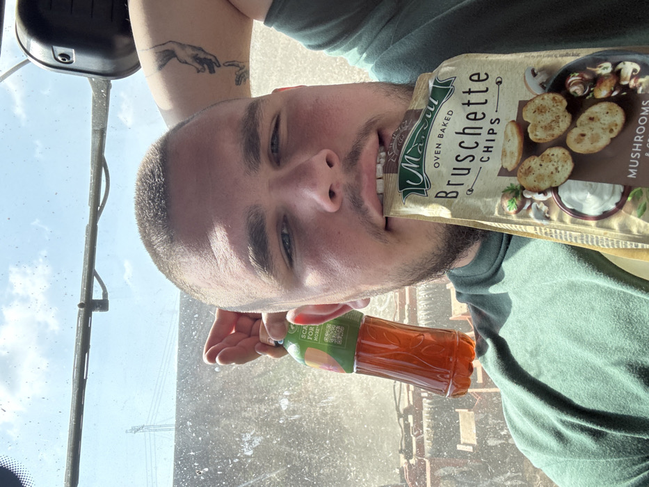 A young adult male is captured in a close-up, selfie-style photograph from inside the cab of what appears to be heavy agricultural machinery. He has short, buzzed dark hair, light stubble, and is wearing a dark green t-shirt. On his left bicep, a tattoo depicting two hands reaching towards each other is visible. The male holds a plastic bottle with orange-colored liquid in his right hand. A bag of "Maruli Oven Baked Bruschette Chips" with "Mushrooms & Cr..." flavor is held in his mouth, with the open end gripped between his teeth. Through the dirty windshield, a bright, clear sky with scattered clouds is visible. Faintly in the background, power lines or industrial structures are discernible, and directly behind the subject, components of agricultural equipment are visible. The scene is set in an agricultural area near Dolna Oryahovitsa, Bulgaria, with no specific landmark within the city identifiable from the image.