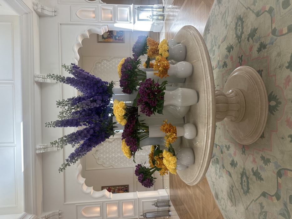 - "The image depicts a grand floral arrangement centered on a round, light-colored marble pedestal table within the opulent lobby of the Mandarin Oriental, Doha, Qatar" by FM-IkaP23, licensed under CC BY 4.0