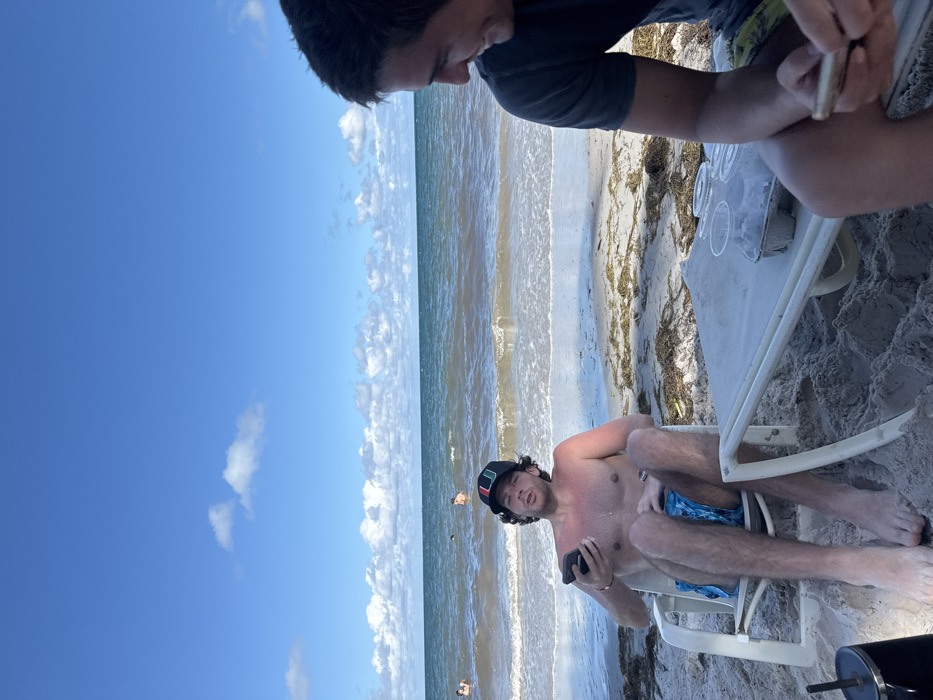 This image depicts a beach scene in Key Biscayne, United States, under a clear blue sky with scattered white clouds. The foreground features two males. On the left, a male with a light skin tone, wearing a dark baseball cap with a "U" logo (green and orange), and blue patterned swim shorts, sits in a white plastic beach chair. He holds a dark smartphone in his right hand, looking forward. His chest and shoulders show signs of mild sunburn. His legs are extended on the sand. To the right, partially visible, is another male with dark hair, wearing a dark t-shirt and patterned swim shorts. He looks towards the left, potentially at the other individual, and holds a light-colored smartphone. Between the two, a light-colored beach lounge chair holds a cardboard tray containing several clear plastic cups. A black insulated cup is visible in the bottom left corner. The sandy beach shows scattered dark seaweed. In the mid-ground, the ocean exhibits moderate waves and appears slightly murky. Several indistinct figures are visible swimming or wading in the water in the background.