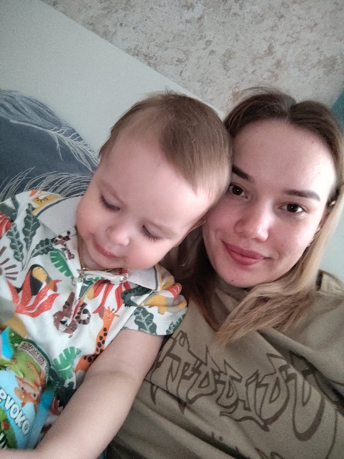 The image displays an indoor close-up portrait of two individuals in the city of Марковский, Russia. On the right, an adult female with light brown hair and a subtle smile looks directly into the camera. She wears a light khaki t-shirt with dark brown graffiti-style lettering. To her left, a young child with light brown hair faces downwards and to the left, away from the camera. The child wears a white short-sleeved shirt adorned with a tropical pattern of giraffes, tigers, toucans, and foliage, and a thin gold-colored chain with a small pendant around the neck. A blue sleeve with partially visible text, "VPVOKO," and an illustration is seen on the child's left arm. The background consists of a dark blue pillow or fabric with a white feather pattern on the left, a plain light-colored wall, and a textured, light beige ceiling or upper wall.