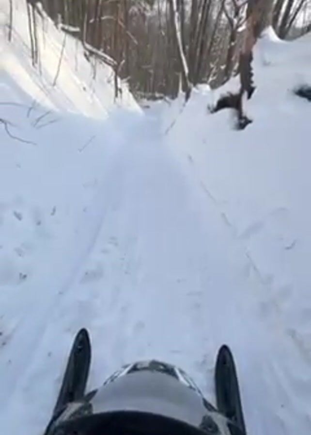 A person is riding a snowmobile through a snowy trail. The trail is narrow, with steep snowbanks on either side, and is surrounded by bare trees. The sky is blue, and the sun is shining. The camera is mounted on the snowmobile, providing a first-person view of the ride.