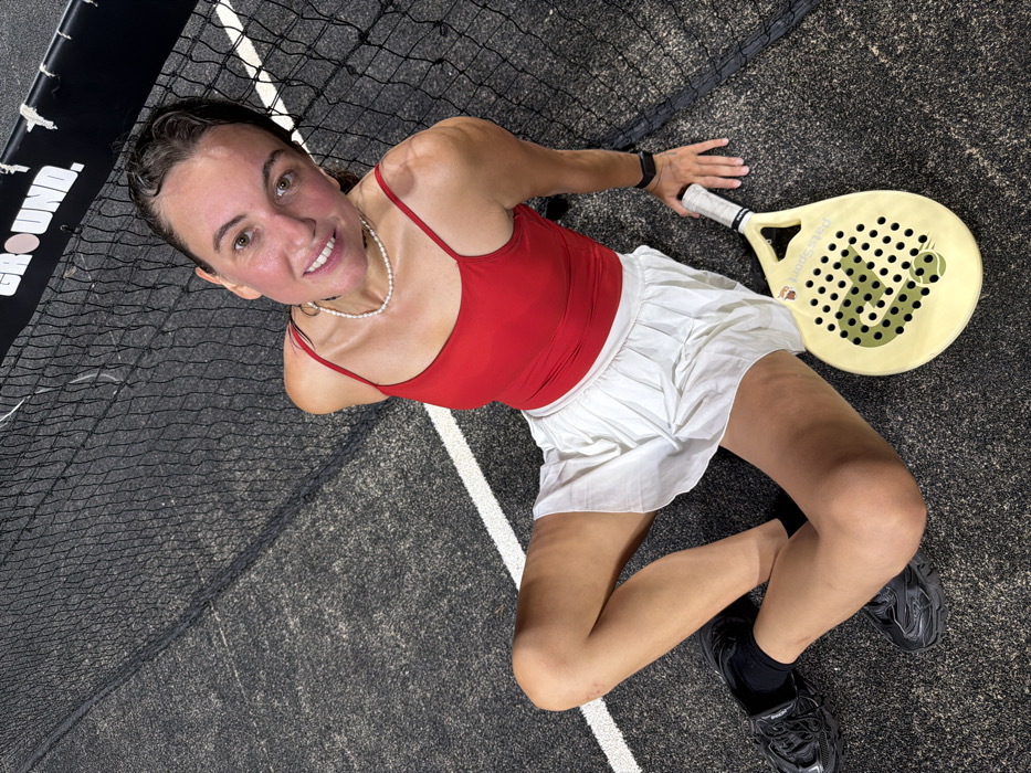A solitary adult female subject is depicted seated on a dark grey sports court surface, identified as being located in Pecatu, Indonesia. She is positioned with her back against a black sports net, the top band of which displays the white text "GROUND.". The woman has brown hair, appears to have a flushed complexion, and wears a red spaghetti-strap top, a white pleated skirt, black sneakers, black socks, and a white pearl necklace. A dark wristband is present on her left wrist. Her legs are bent at the knees, and she looks directly upward at the viewer with a smile. Adjacent to her right hip, a light yellow padel racket with a perforated face, featuring a dark green question mark graphic incorporating a tennis ball and the text "Padel Sport," rests on the court. White court lines are visible on the dark grey playing surface.