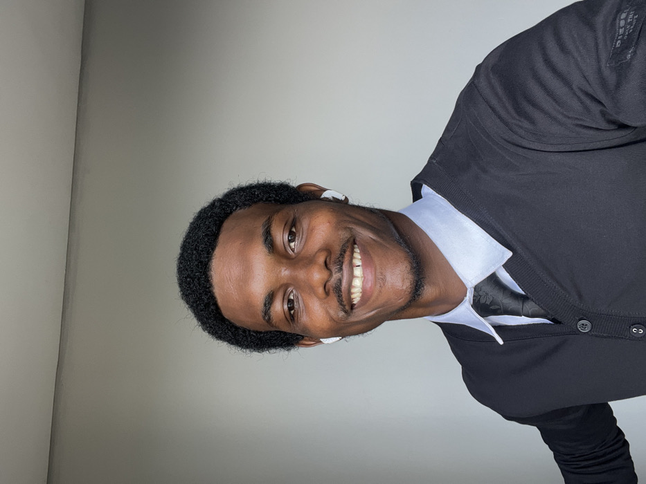 A smiling Black man wearing a light blue collared shirt, dark tie, and black cardigan. The cardigan has small black buttons. He has short dark hair and is wearing white earbuds. The background is a light gray wall. The man appears to be indoors and well-lit. He is positioned at a slight angle in the frame.