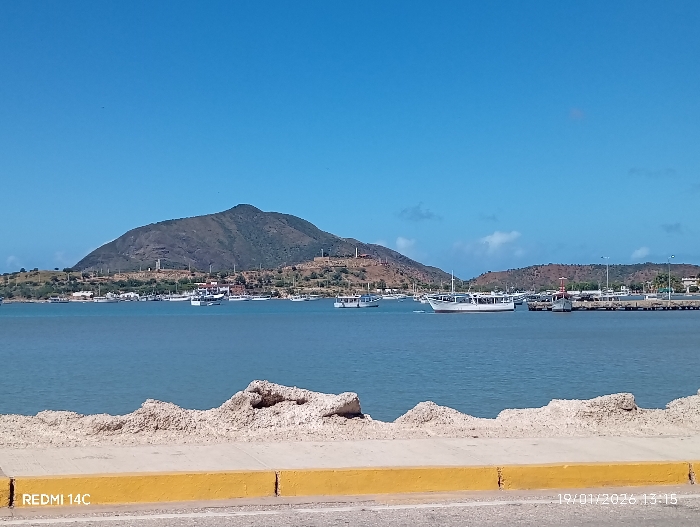 A serene landscape captures a harbor with gentle waters under a clear blue sky. Several boats dot the water, and a prominent mountain rises in the background, adorned with structures at its base and on its slopes. A man-made barrier, constructed of weathered rock and finished with a yellow painted line, is in the foreground. The date "19/01/2026" and "Redmi 14C" are visible in the lower corners.