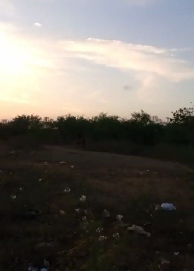 person walking alone in a field during sunset. The foreground is slightly out of focus and contains dirt and some scattered trash. In the middle ground, there's a figure of a person walking on a dirt path near a line of trees. The background showcases a colorful sky with the sun setting. The overall scene is somewhat desolate, with the person appearing solitary amidst the expansive field.