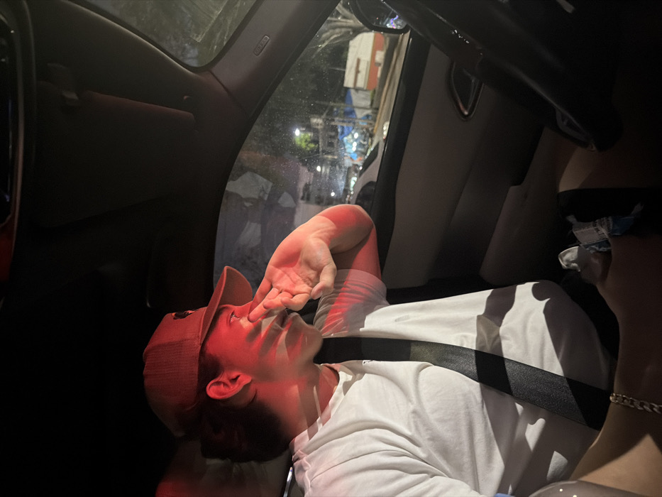 Inside a car, a person wearing a red baseball cap and a white shirt is reclined in the passenger seat with a seatbelt on. Their hand is near their face, specifically their nose. The interior is dark, but through the window, one can see an urban street scene at night. The view shows buildings and streetlights, giving a glimpse of the outside environment.