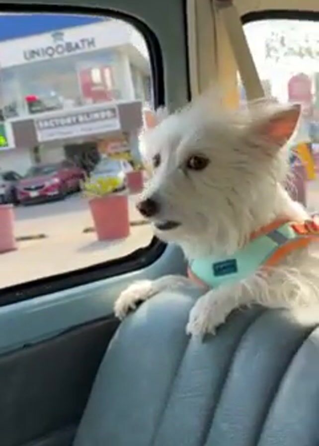 A small, white, furry dog sits in the passenger seat of a light-blue car and looks out the open window at the passing scenery. The dog is wearing a light blue and orange harness. The car appears to be moving slowly on a street with commercial buildings. The dog looks around attentively.