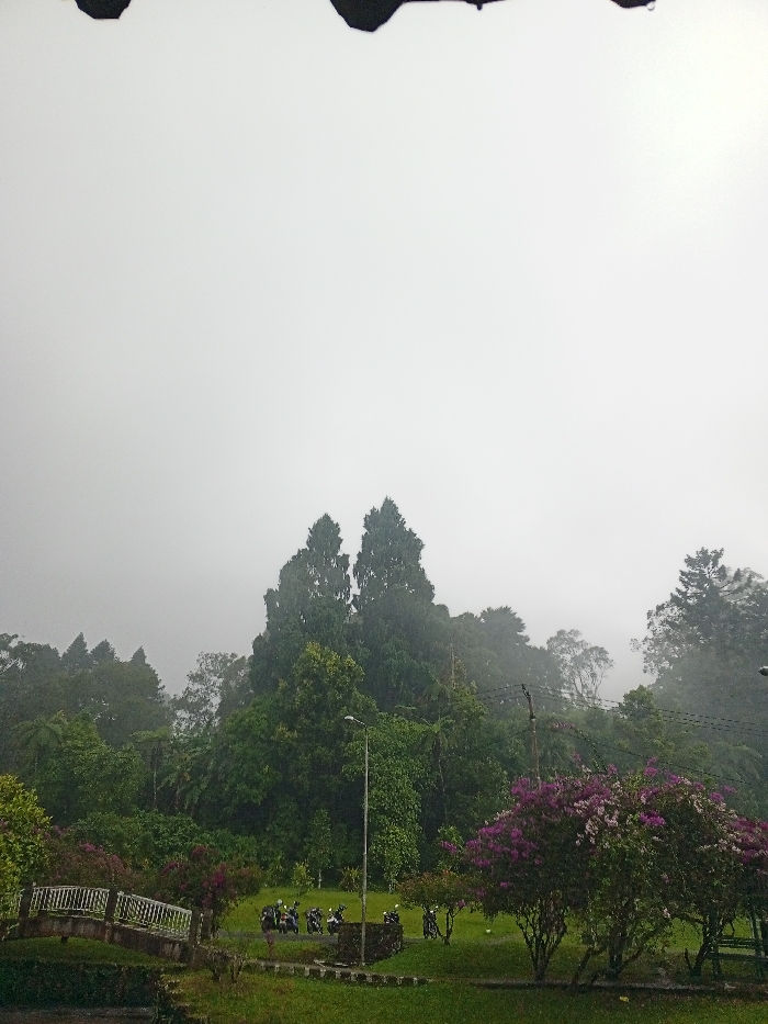 A foggy landscape features lush green trees and foliage, shrouded in mist. In the foreground, a small bridge crosses a water feature, and purple-flowered bushes stand prominently. Several motorcycles are parked near a lamp post. The sky is overcast and white. Dark roof details can be seen in the upper edge of the image.