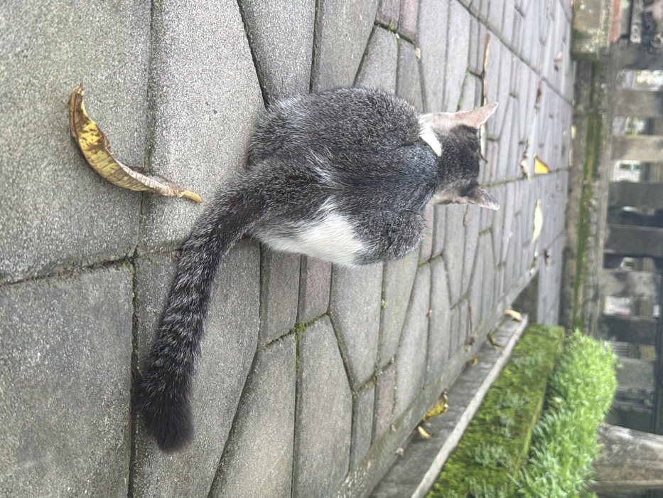 - "A domestic cat sits on a grey hexagonal paver pathway in Batuan, Indonesia" by FM-O74923, licensed under CC BY 4.0