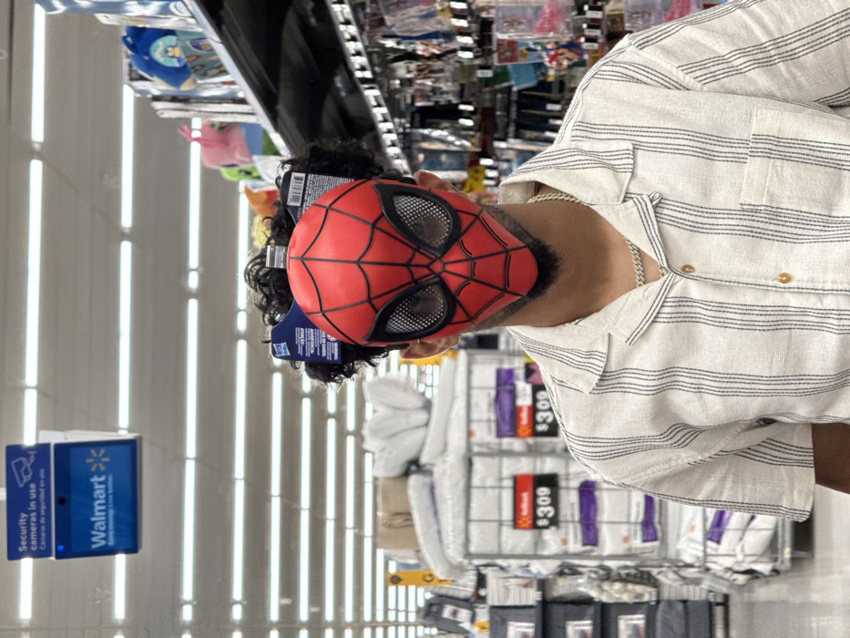 The image displays an individual standing within a Walmart store, identified as being in Sacramento, United States. The person's face is obscured by a red Spider-Man mask featuring a black web pattern and black-rimmed, white-mesh eye sections. Product tags are visibly attached to the top of the mask. Visible hair above and around the mask is dark and curly, and a short beard or goatee is present below the mask. The individual wears a light-colored, short-sleeved collared shirt with thin dark vertical stripes and a silver-colored chain necklace. To the left of the individual, a large wire display rack is stacked with white textile items, accompanied by price signage indicating "$309" and a "Rollback" label. To the right, a store aisle features shelves stocked with various merchandise, including colorful plush items. The ceiling is illuminated by horizontal fluorescent strip lighting, and a suspended blue sign displays "Security cameras in use" along with the "Walmart" logo and slogan.