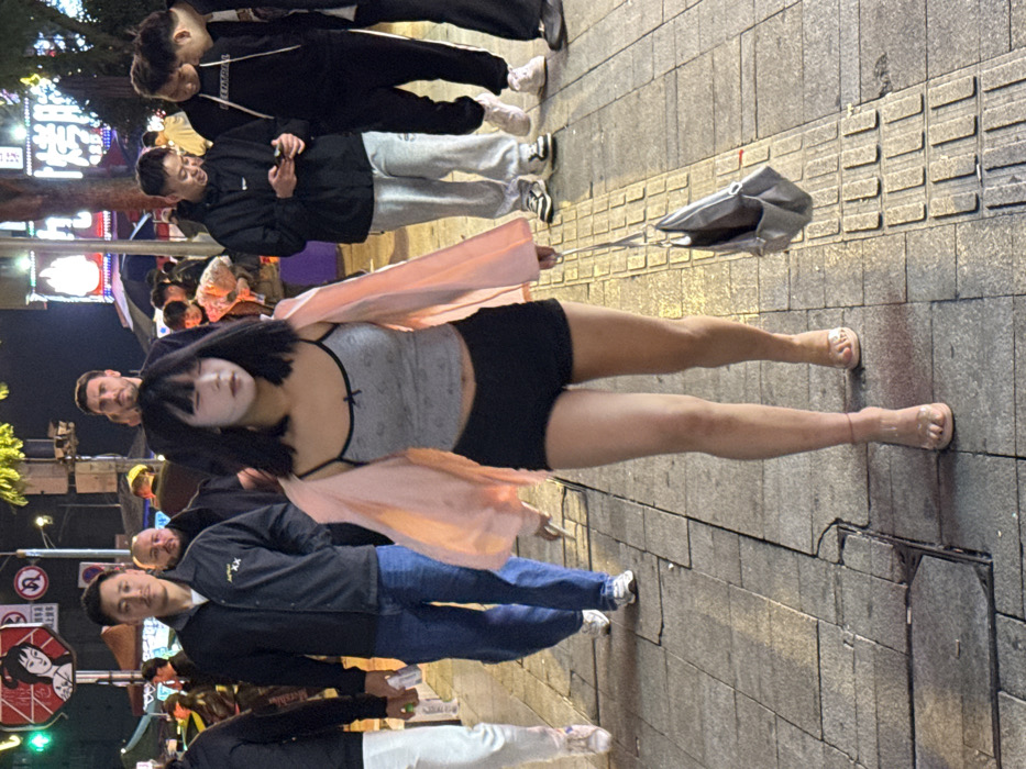 A nighttime street scene in Jiangbei, China, depicts a bustling urban sidewalk under artificial illumination. In the foreground, a young East Asian female with shoulder-length black hair and bangs walks towards the viewer. She wears a light grey spaghetti-strap crop top with a small black bow, black shorts, and a light pink long-sleeved shirt worn unbuttoned over the top. Her footwear consists of clear high-heeled sandals with light-colored soles. White makeup is applied around her eyes and nose, and her gaze is directed downwards. She holds a light grey shoulder bag in her right hand by its strap. Behind her and to the left, an East Asian male with a mustache, wearing a dark jacket and blue jeans, walks forward. Further back, a heavier-set male with a shaved head and a Caucasian male with a beard are visible among other pedestrians. To the right and behind the central figure, an East Asian male in a black hoodie and light grey sweatpants looks at a mobile phone. Another East Asian male in a black long-sleeved shirt stands nearby. The paved sidewalk is constructed of large rectangular tiles, with tactile paving visible on the right side. The background features illuminated commercial signs, including one with a stylized female character on a red octagonal sign and another displaying Chinese characters. Streetlights and overhead fixtures provide general illumination to the crowded environment.