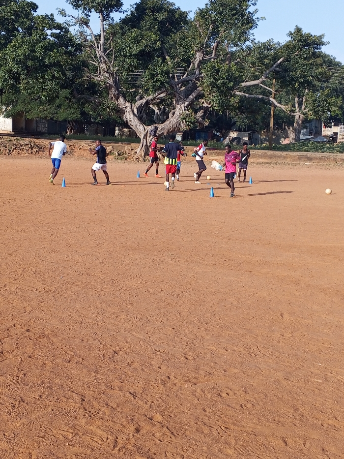 A group of male athletes are training on a dirt field. They wear various athletic outfits, including jerseys in white, black, red, and pink. Blue cones are scattered across the field to mark their course. A soccer ball is visible both within the group and at a distance. A large, sprawling tree stands in the background, providing shade for the training area. Buildings are partially visible behind the tree.