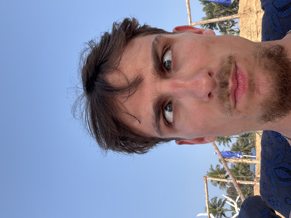 A medium close-up image taken in Sinquerim, India, features a male individual with dark brown, disheveled hair, blue eyes, a mustache, and a goatee, making a cross-eyed expression with pursed lips
