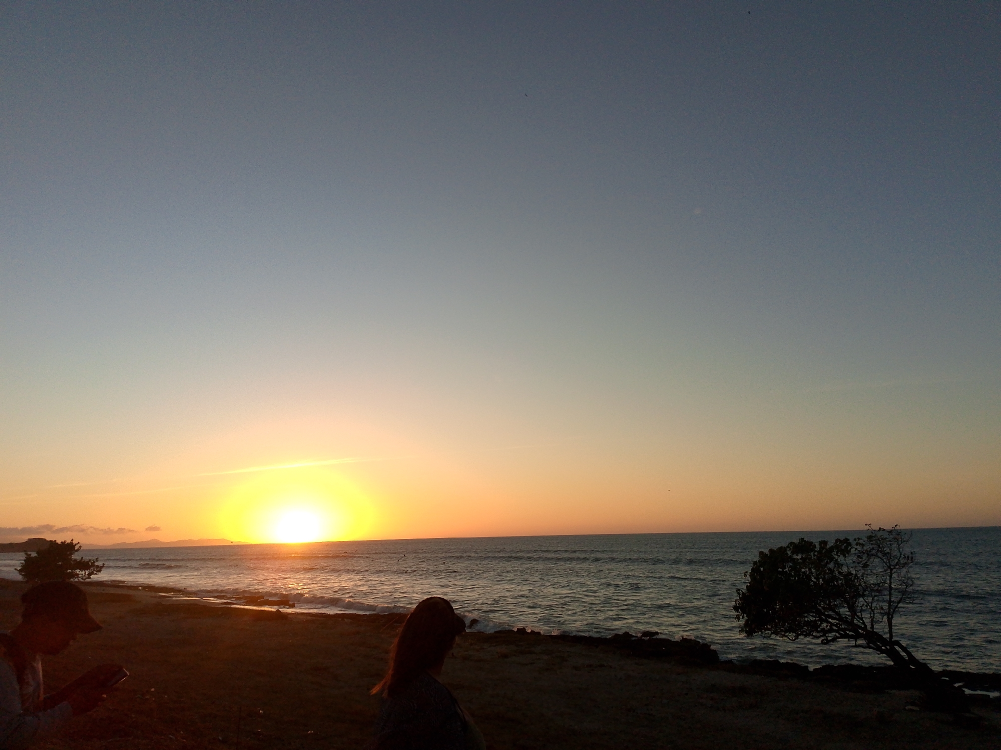 A sunset scene at Juan Griego, Venezuela, featuring a coastline view