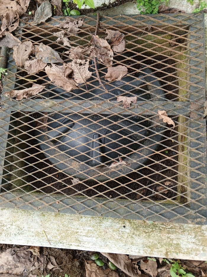 A square metal grate covers a recessed black container. The grate has a diamond pattern and is partially obscured by scattered dry leaves and debris. The container below is visible through the grate, partially filled with dark matter. The grate's frame has some moss or lichen. The background includes dirt, more leaves, and some green vegetation.