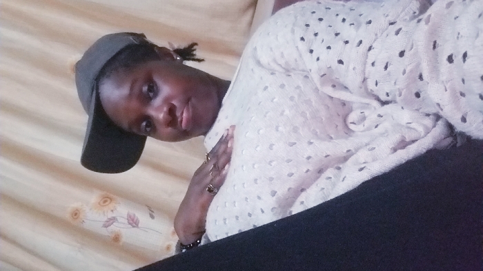 This image depicts a single individual, a young Black female, photographed indoors from a slightly low angle