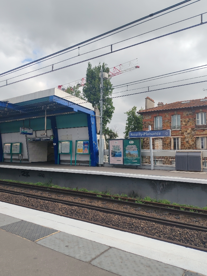The image depicts a railway station platform under an overcast sky in Neuilly-Plaisance, France