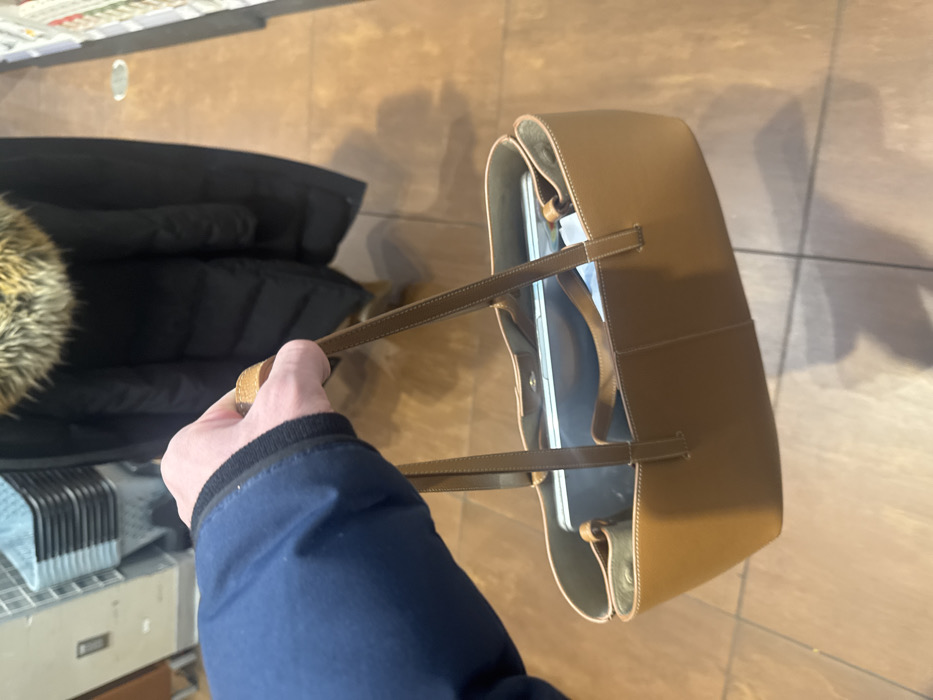 A person holds a tan leather tote bag. The bag has long, thin handles, and a laptop is inside. The person wears a blue jacket. In the background, there is a black puffer coat with a fur-trimmed hood, a white wire shelf unit, and a tiled floor.