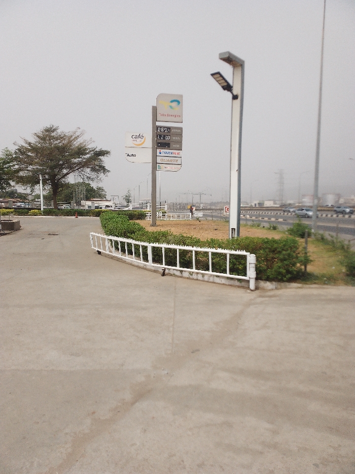 The image depicts an outdoor scene at what appears to be a TotalEnergies service station entrance in Jiru, Nigeria, under an overcast or hazy sky. The foreground features a grey concrete pavement, with a white, segmented metal barrier, topped with spikes and equipped with small wheels, curving along its right edge. This barrier separates the pavement from a strip of neatly trimmed green shrubs and dry earth. In the mid-ground, a tall, vertical multi-panel sign stands prominently. It displays the "TotalEnergies" logo at its apex, followed by fuel price information: "PREMIUM 889.0" and "L230," along with logos or text for "TOUCHPOINT," "QUARTZ," and "MOTOLU." To the left of this primary sign, a smaller white sign indicates "café bonjour" and "Auto." Adjacent to the TotalEnergies sign on its right, a grey utility pole supports a double-headed LED street light fixture. To the left of the signage, a large, mature tree with a wide, spreading canopy is visible. Beyond the vegetated strip and a dirt median, a multi-lane highway or major road extends horizontally across the background, showing multiple vehicles indicating active traffic. One individual, dressed in a light-colored top and dark trousers, is visible standing near the road in the mid-ground, facing towards the right. In the distant background, industrial or urban structures, including storage tanks and buildings, are discernible through the atmospheric haze.